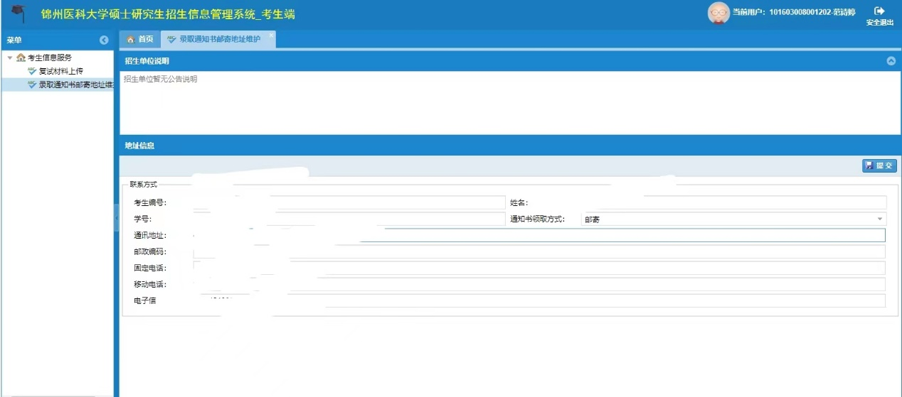2.选择界面:考生选择“考生信息服务”→“录取通知书邮寄地址维护”,考生在所选界面中确认相关信息,若无需修改可直接退出;若重新修改,在填写确定无误后点击“提交”。